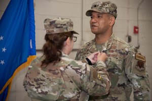 June 9, 2023 4th MUNS holds change of command ceremony Col. Kathryn Roman, left, 4th Maintenance Group commander, awards the Meritorious Service Medal to Lt. Col. Marvin Hinkson, right, 4th Munitions Squadron outgoing commander, during the 4th MUNS change of command ceremony at Seymour Johnson Air Force Base, North Carolina, June 1, 2023. In keeping