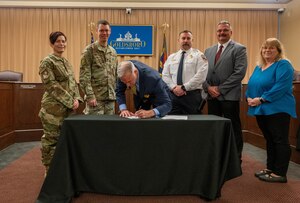 June 26, 2023 Goldsboro police, fire departments to have access to 4FSS facilitie Tim Salmon, center, Goldsboro city manager, signs a memorandum to allow Goldsboro police and fire departments to have access to Seymour Johnson Air Force Base facilities in Goldsboro, North Carolina, March 27, 2023. The GPD and GFD will be allowed to utilize facilities such as the base exchange,