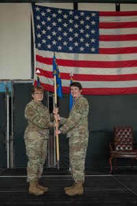 June 28, 2023 333rd FGS holds change of command Maj. Lauren Kruse, left, incoming 333rd Fighter Generation Squadron commander, accepts the guidon of Col. Kathryn Roman, left, 4th Maintenance Group commander, during a change of command ceremony at Seymour Johnson Air Force Base, North Carolina, June 23, 2023. Base and community leadership, along