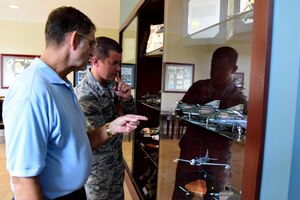 Sept. 27, 2017 4th Fighter Wing model aircraft display Retired Tech. Sgt. Bob Dedmon (left), discusses model aircraft with Col. Brian Armstrong, 4th Fighter Wing vice commander, Sept. 27, 2017, at Seymour Johnson Air Force Base, North Carolina. Dedmon spent more than 10 years researching and building the model aircraft associated with the 4th Fighter