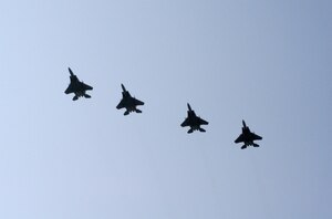 July 25, 2016 The 44th anniversary of the F-15 A four ship of F-15E Strike Eagles from Seymour Johnson Air Force Base, North Carolina perform a flyover for the Salute the Troops parade in downtown Raleigh, North Carolina, April 26. The intent of the event was to gather the people of North Carolina together to show appreciation to all of the
