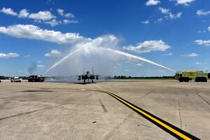 June 9, 2016 4th OG commander takes final F-15E Strike Eagle flight Lt. Col. Nate Hesse, 4th Operations Group deputy commander and pilot, and Col. Brian Afflerbaugh, 4th OG commander and weapons systems officer, taxi under a water arch June 8, 2016, at Seymour Johnson Air Force Base, North Carolina. Afflerbaugh was completing his final mission as group commander.