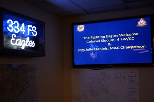 June 16, 2016 Community, base leader fly together Col. Mark Slocum, 4th Fighter Wing commander, and the 334th Fighter Squadron, welcome Julie Daniels, Military Affairs Committee chairperson, June 14, 2016, at Seymour Johnson Air Force Base, North Carolina. Daniels was invited to take a familiarization flight with Slocum in an F-15E Strike Eagle.