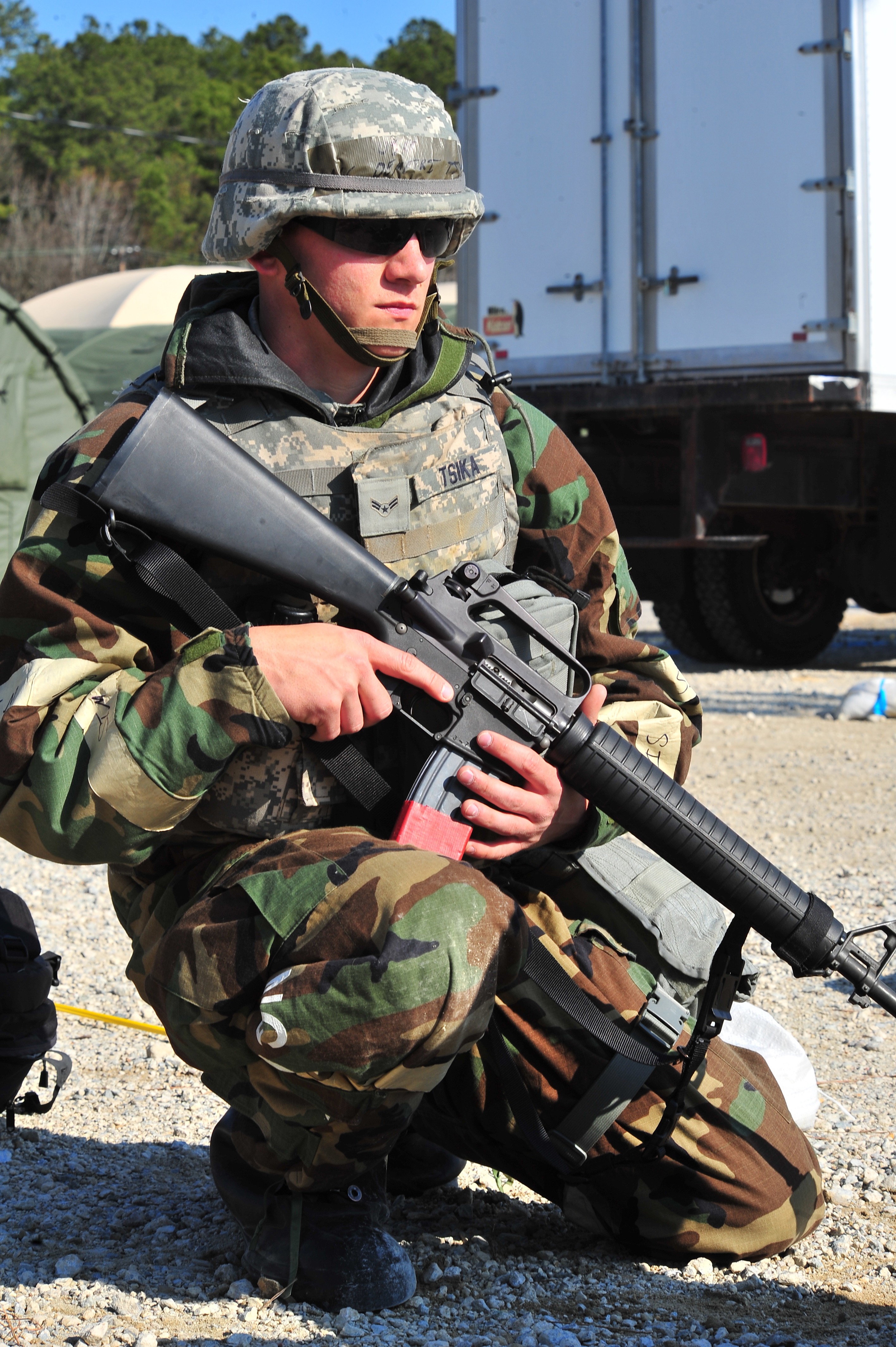 U.S. Air Force Airman 1st Class Demetri Tsika, 4th Civil Engineer Squadron structures journeyman, hammers a nail into a wooden board during Operational Readiness Inspection CORONET WHITE, at a simulated deployed location on Seymour Johnson Air Force Base, N.C., Mar. 7, 2013. Tsika re-enforced a defensive fighting position, used by 4th Security Forces Squadron personnel, to provide all-around cover from enemy fire and allow them to observe and repel enemy forces. (U.S. Air Force photo/Airman 1st Class Aubrey White/Released)