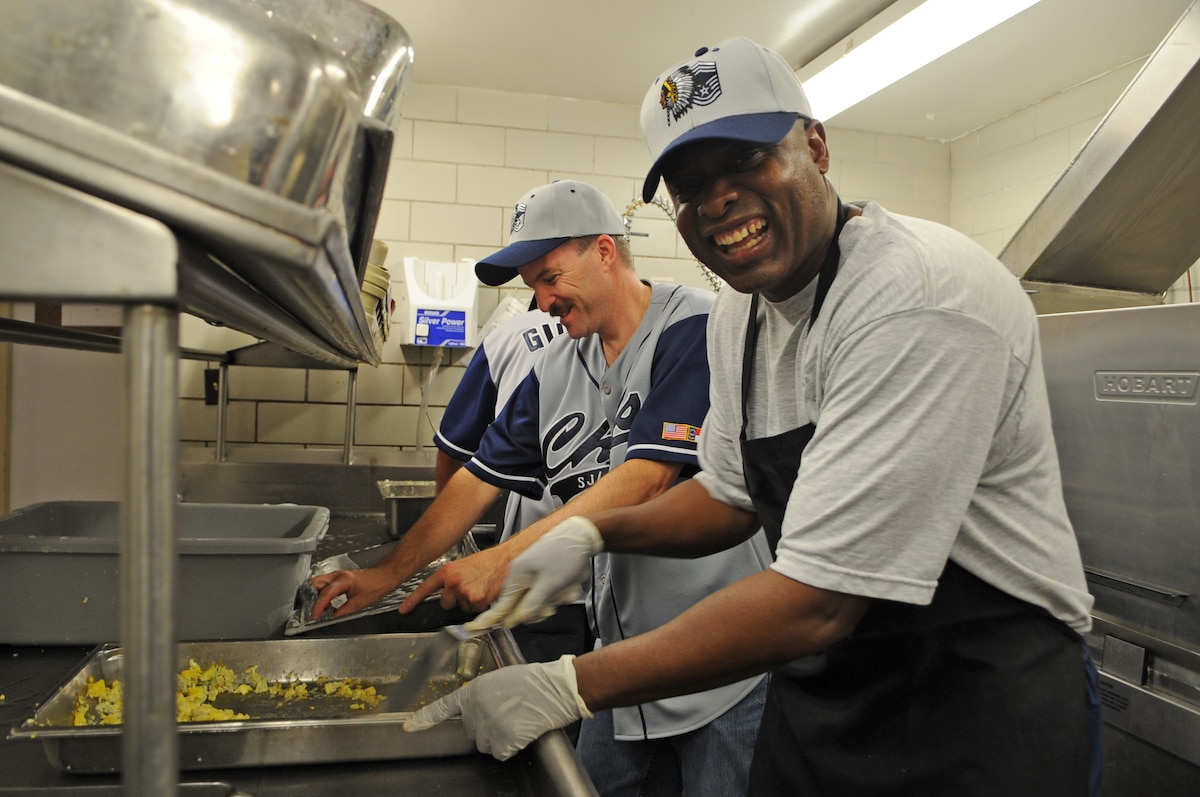 U.S. Air Force Chief Master Sgts. Scott Stevenson, 4th Operations Support Squadron chief controller at radar approach and control, and Thom Trottier, 4th Medical Group superintendent, cook eggs during a Chief’s Group pancake breakfast on Seymour Johnson Air Force Base, N.C., Aug. 10, 2012. Airmen and family members were offered a selection of scrambled eggs, sausage, orange juice, coffee and unlimited pancakes. (U.S. Air Force photo/Airman 1st Class Aubrey Robinson/Released)