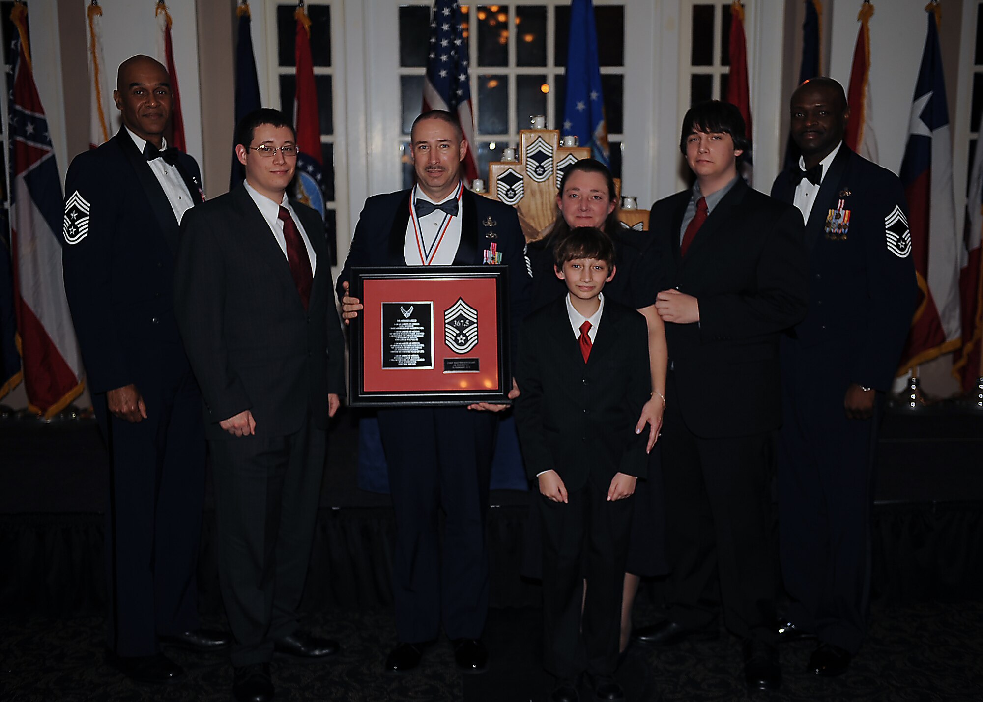 Vernesha and Tony Townsend, wife and son of Senior Master Sgt. Tony Townsend, 4th Communications Squadron superintendent, pose with Chief Master Sgt. Leroy Frink, 4th Fighter Wing command chief, and Chief Master Sgt. Antonio Baxter, 6th Maintenance Group superintendent, MacDill Air Force Base, Fla., during the Chief Recognition Ceremony on Seymour Johnson Air Force Base, N.C., Feb. 13, 2010. Townsend, who is currently deployed, hails from Garland, N.C. (U.S. Air Force Photo/Senior Airman Ciara Wymbs)