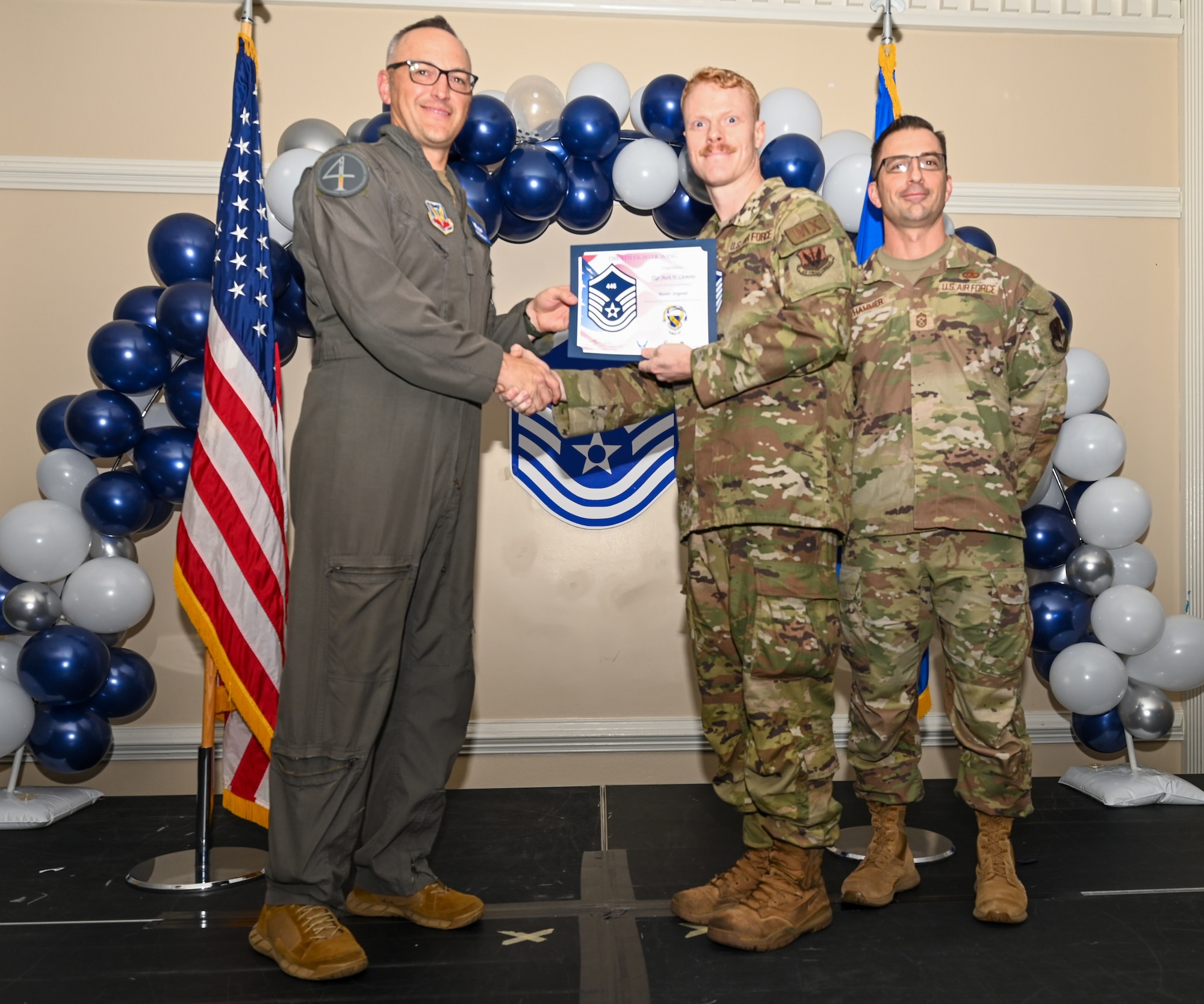 U.S. Air Force Col. Steven Bofferding, 4th Fighter Wing deputy commander (left), and Chief Master Sgt. Paul Hammer, 4 FW command chief, present a certificate to Master Sgt. select Joseph Phipps (center), 4th Equipment Maintenance Squadron crashed, damaged, and disabled aircraft recovery section chief, during a Master Sergeant Release Ceremony at Seymour Johnson Air Force Base, North Carolina, June 6, 2024. A total of 5,500 Airmen were promoted among a pool of 29,497 across the Air Force. (U.S. Air Force photo by Airman Rebecca Tierney)
