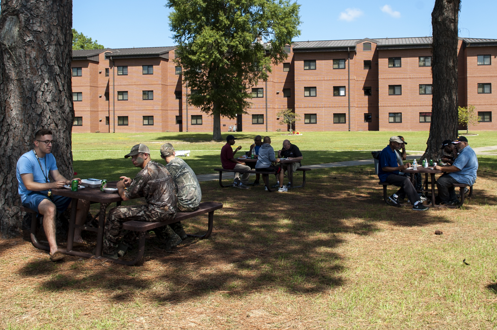 Dorm Airmen receive free food during a dorm dwellers barbecue event, Sept. 19, 2015, at Seymour Johnson Air Force Base, North Carolina. The biannual event, hosted by the 4th Fighter Wing Chaplain Corps’ Protestant Men of the Chapel, aims to give Airmen an avenue to get out of their dorms and enjoy time spent together. (U.S. Air Force photo/Airman 1st Class Shawna L. Keyes)