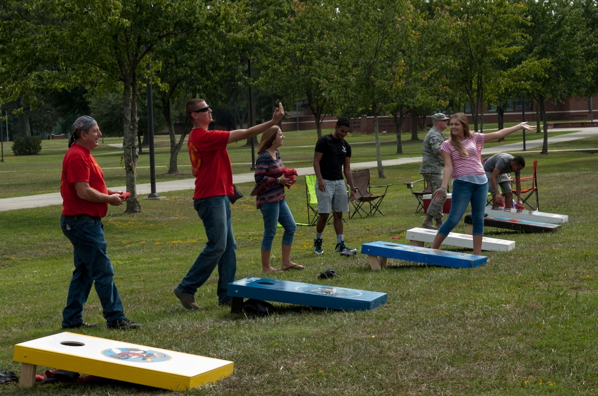 Staff Sgt. Virgil Bass (left), 4th Civil Engineer Squadron Airmen dormitory leader, laughs as he pies Staff Sgt. Alicia Peña, 4th CES ADL, during the Summer Music Fest, Aug. 29, 2015, at Seymour Johnson Air Force Base, North Carolina. Multiple pies were auctioned off during the event, with proceeds benefitting the Airmen’s Dorm Council. (U.S. Air Force photo/Airman 1st Class Shawna L. Keyes)