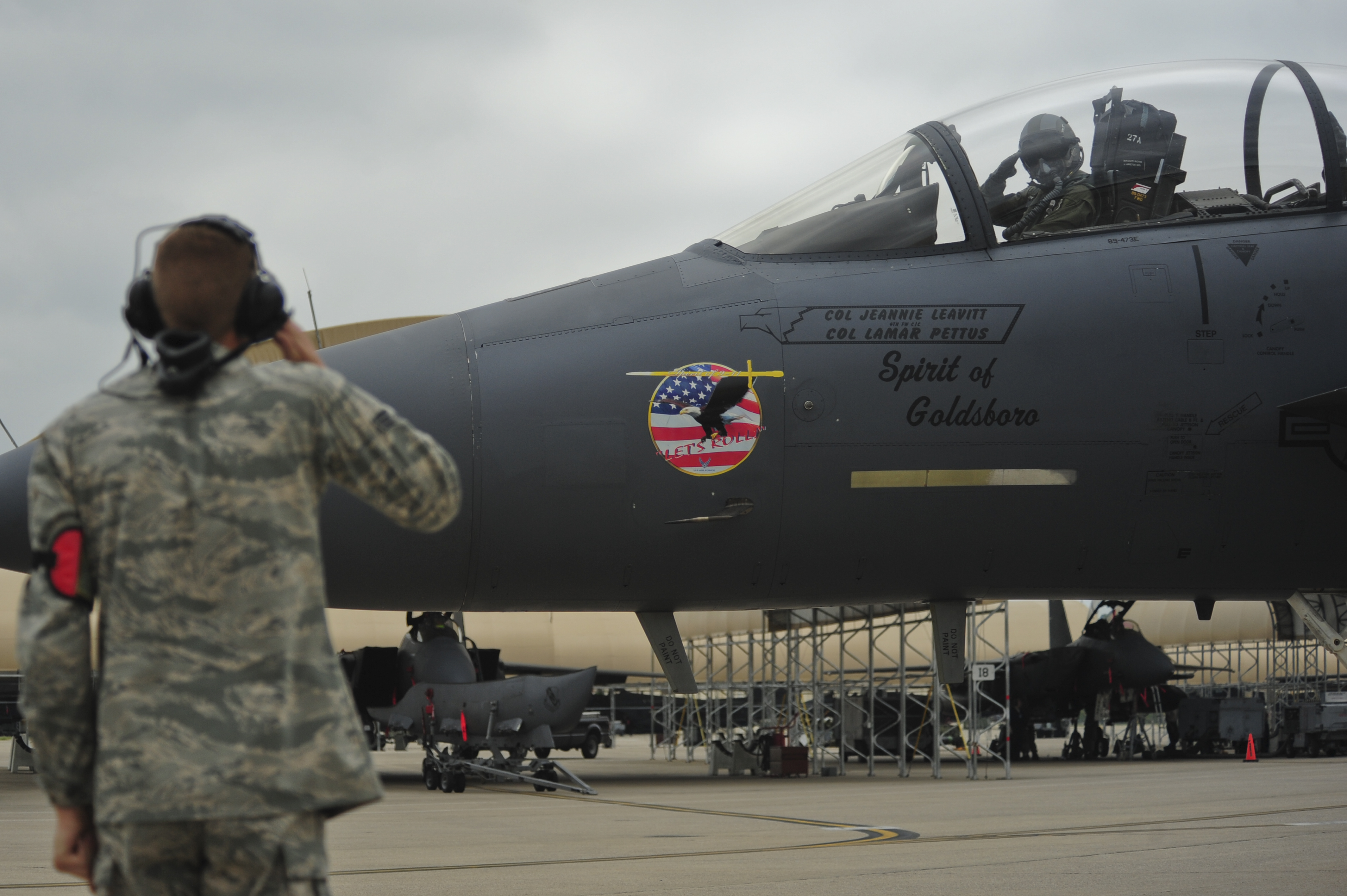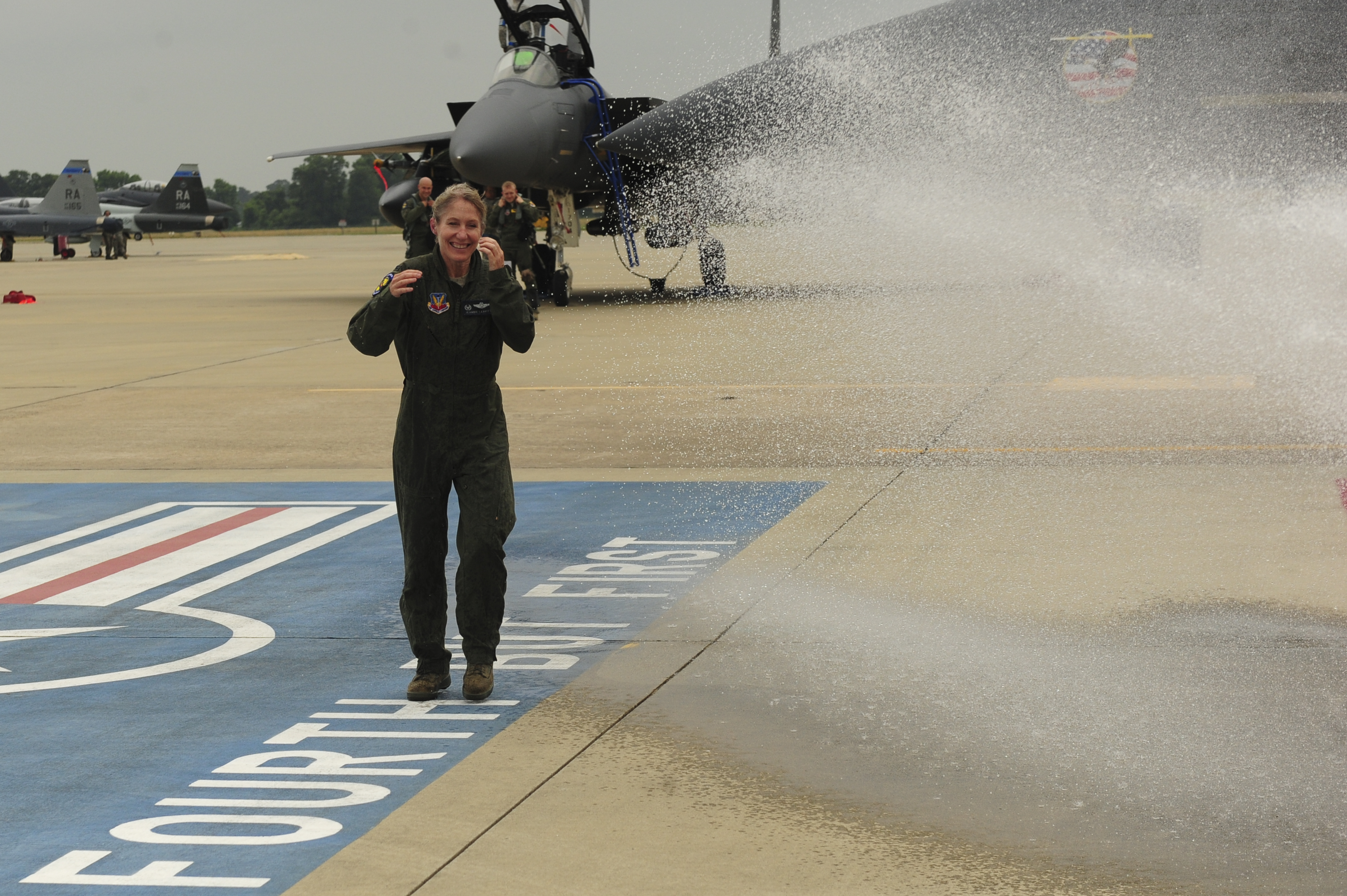 Col. Jeannie Leavitt, 4th Fighter Wing commander, and Capt. Brian Privette, 333rd Fighter Squadron weapon systems officer, step to their jet, May 29, 2014, at Seymour Johnson Air Force Base, North Carolina. The flight was Leavitt’s last as commander of the 4th FW. She will relinquish command June 2, to incoming commander, Col. Mark Slocum. (U.S. Air Force photo/Airman 1st Class Brittain Crolley)
