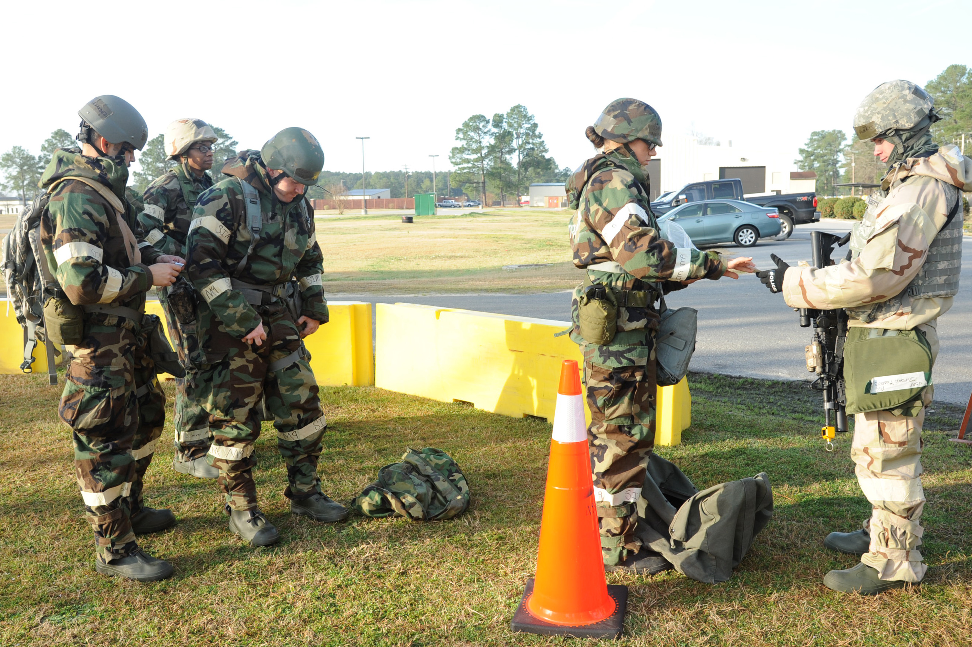 U.S. Air Force Airman 1st Class Jordan Roberts checks identification and accountability cards at the entry control point on Base X during a Phase II Operational Readiness Exercise on Seymour Johnson Air Force Base, N.C., March 7, 2012. Entry controllers performed 100 percent identification checks and hands-on searches on hand held items and vehicles gaining entrance to the installation. Roberts, 4th Security Forces Squadron force patrolman, is from St. Pauls, N.C. (U.S. Air Force photo/Senior Airman Whitney Stanfield/ Released)