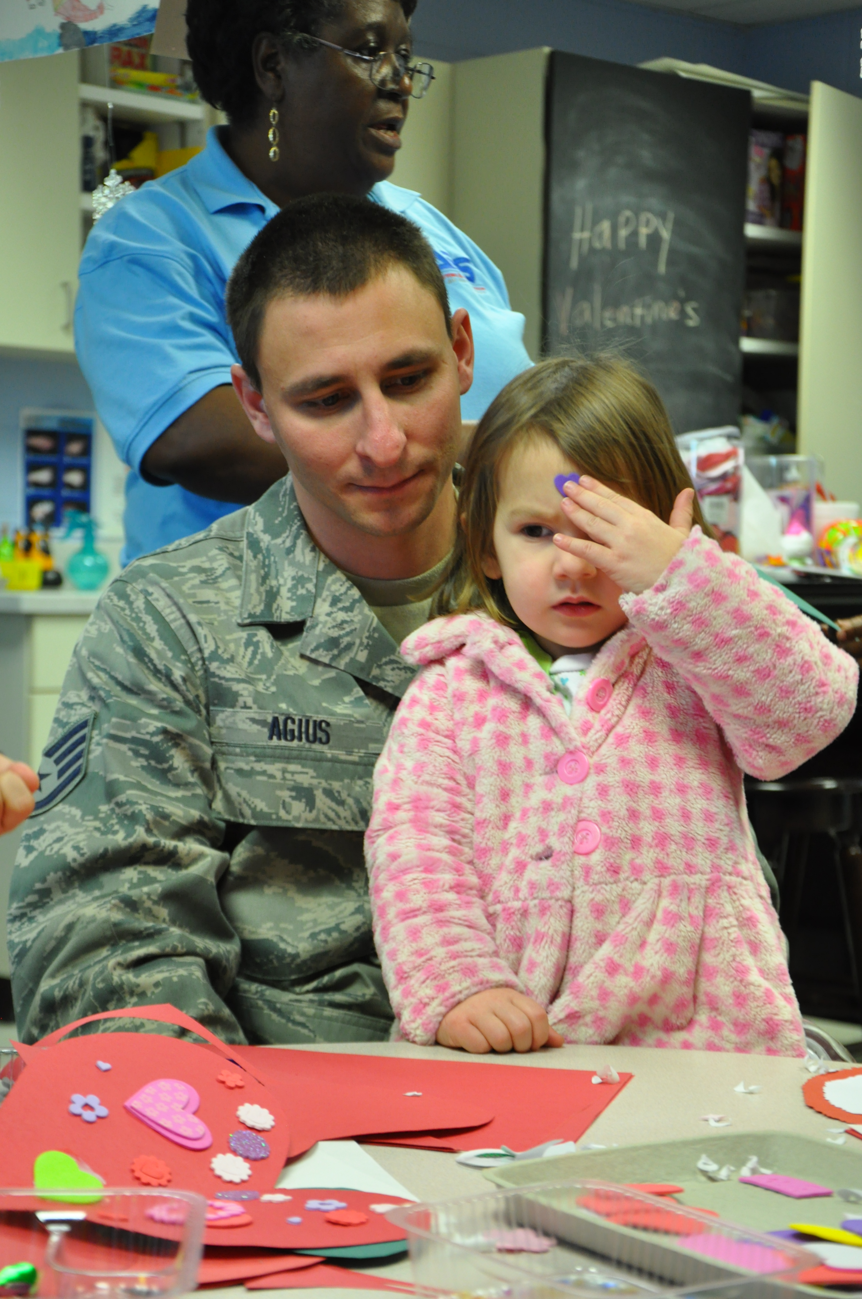 Staff Sgt. Anthony Agius sits with daughter, Isabella, at the Youth Center on Seymour Johnson Air Force Base, N.C., Jan. 6, 2012. Isabella, 2, participates in making Valentine’s Day cards for Airmen deployed to Bagram Airfield, Afghanistan. Children from the Youth Center have made more than 50 cards and will continue to make more before sending out a care package to deployed Airmen from the 4th Fighter Wing. Agius, 911th Air Refueling Squadron crew chief, hails from Charleston, S.C. (U.S. Air Force photo by Airman 1st Class Mariah Tolbert)