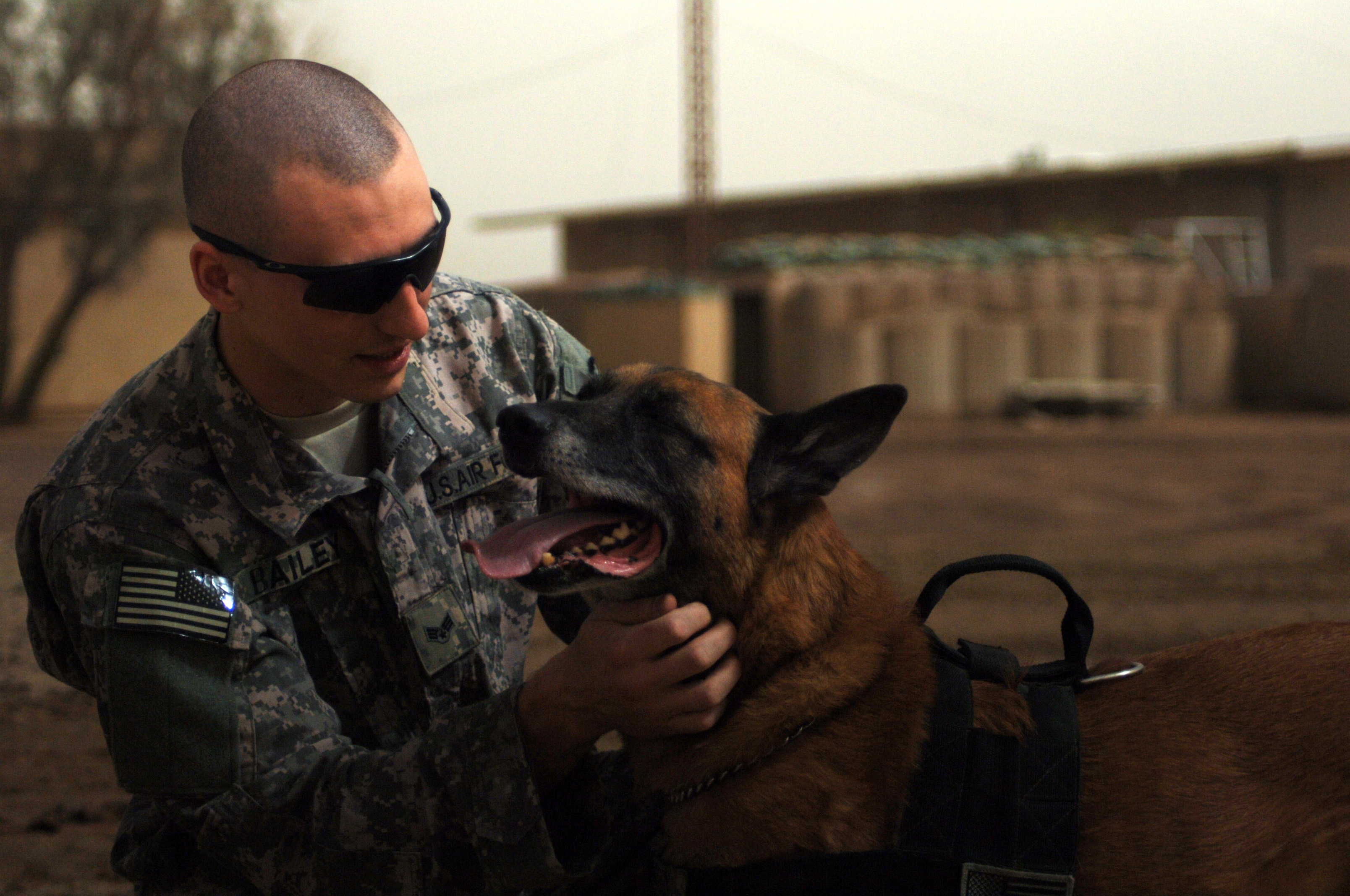 CAMP TAJI, Iraq -- Senior Airman William Bailey, a military working dog handler and Joint Expeditionary Tasking Airman from the 732nd Air Expeditionary Group attached to the Army's 1st Calvary Division, praises Robby, his nine-year-old Belgian Malinois patrol, explosives detector dog, after he successfully completed an obstacle course as part of daily training here. Airman Bailey and Robby are deployed here from the 4th Security Forces Squadron, Seymour Johnson Air Force Base, N.C. Airman Bailey is a native of Richmond, Va. (U.S. Air Force photo/Staff Sgt. Dilia Ayala)
