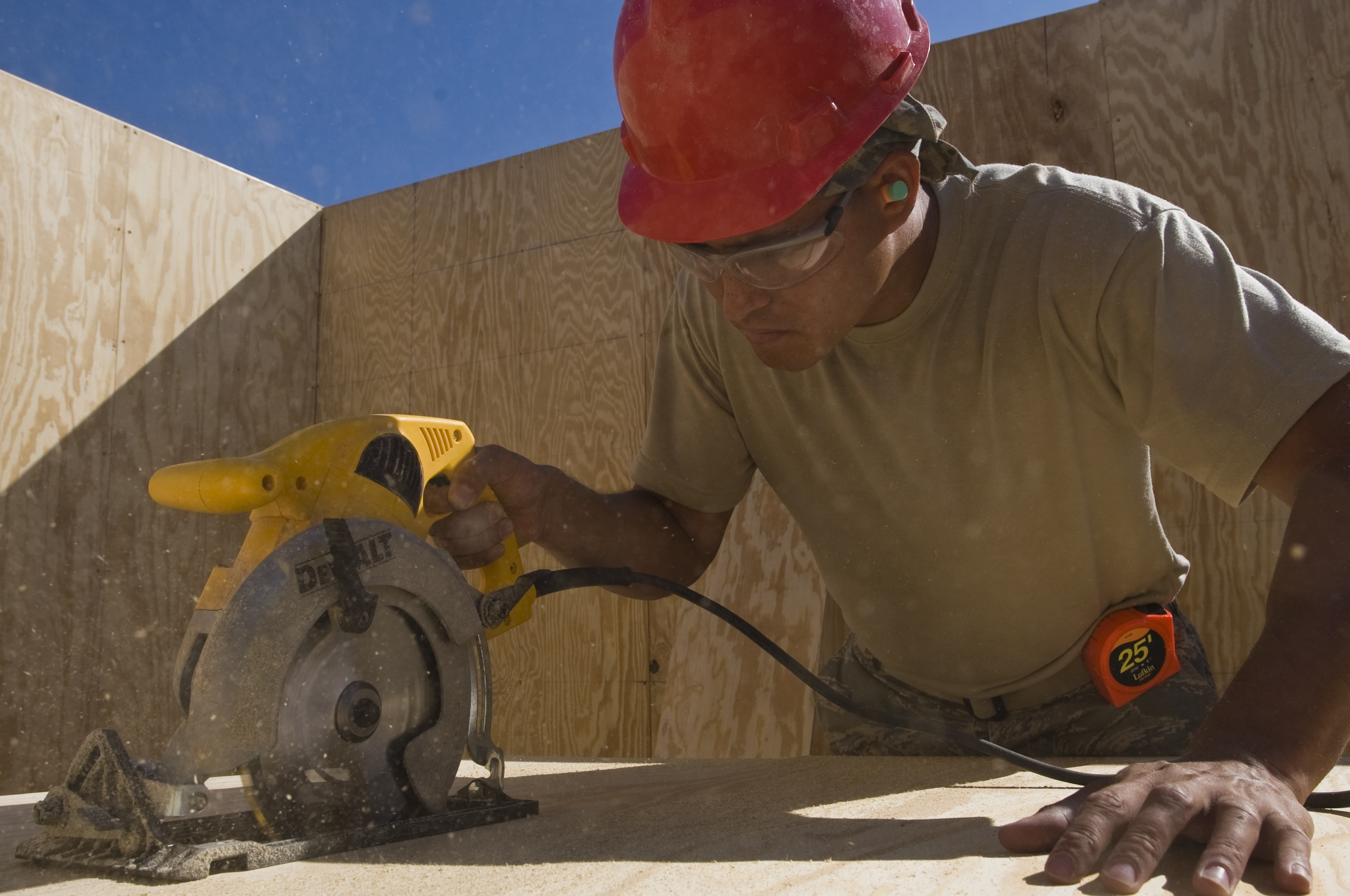ALI BASE, Iraq -- Airman 1st Class Jerry Perez, 557th Expeditionary RED HORSE Squadron structural apprentice, cuts wood for the walls Nov. 7, 2008. The Airmen from the 557th ERHS look to improve work conditions by constructing a new unit work center here. Perez is deployed from Seymour Johnson Air Force Base, N.C. His hometown is Wichita, Kan. (U.S. Air Force photo/Senior Airman Christopher Griffin)