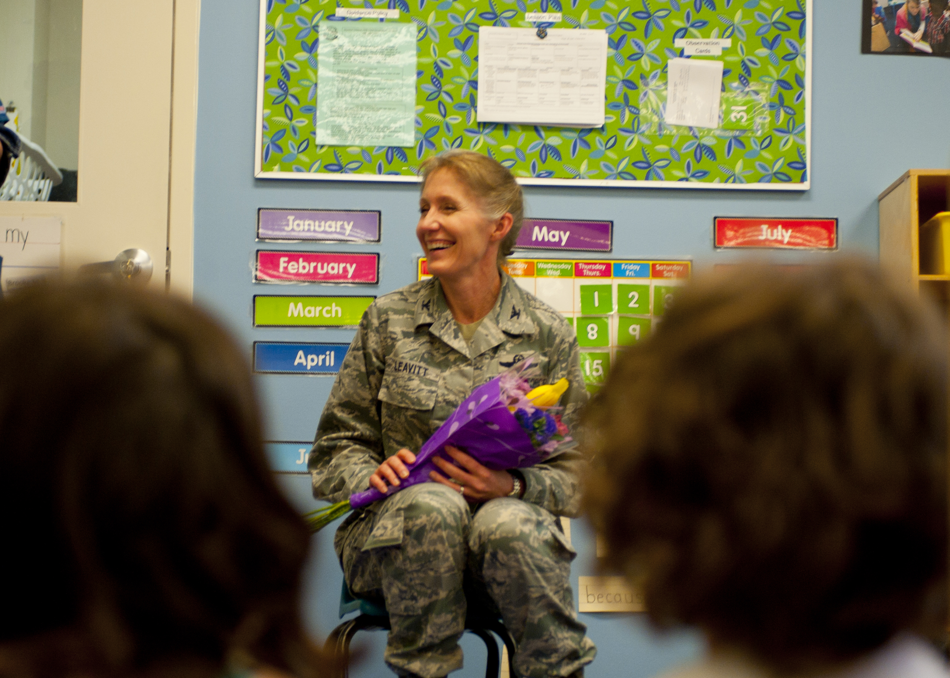 Col. Jeannie Leavitt, 4th Fighter Wing commander, talks with the Child Development Center preschool class, May 2, 2014, at Seymour Johnson Air Force Base. The class presented Leavitt with a bouquet of flowers and a mural in appreciation for her participation in Child Abuse Prevention Month. Leavitt signed a proclamation in April reinforcing Team Seymour’s commitment to helping children who have been abused. (U.S. Air Force photo by Staff Sgt. Michael Charles)